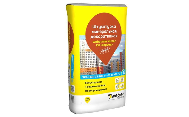 Декоративная штукатурка weber.min для тонкослойной финишной отделки в системах фасадного утепления. Подходит для декоративной отделки стен внутри и снаружи помещений, с последующей окраской вододисперсионными красками.