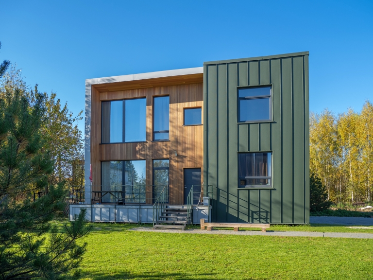 • При использовании покрытия Colority® Print, «ЭкоБрус GL» достигает максимального сходства с клееным брусом. Надежное скрытое сцепление панелей придает фасаду здания естественный вид.